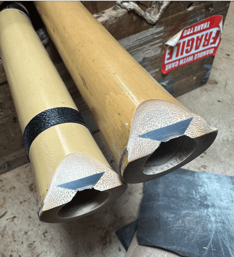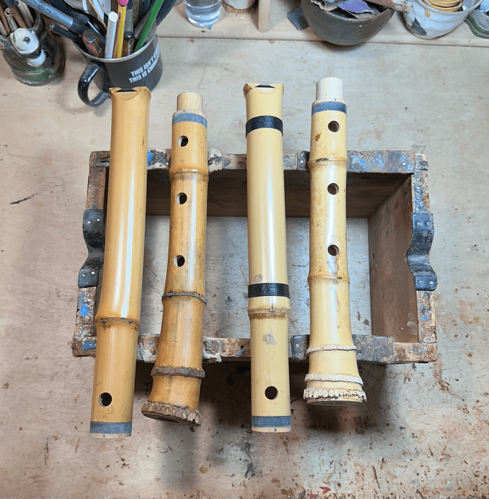 These are my Jiari Shakuhachi commissions in-progress. They are a 6-month to 1 year wait. These are contemporary, fine-tuned instruments. The bore has Japanese plaster applied to shape for tonal qualities, faster response, and pitch accuracy. These are flutes used by professional musicians. These can be pitched A=440hz – 442 hz.