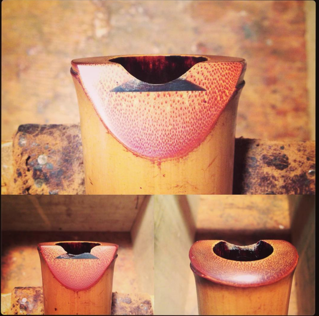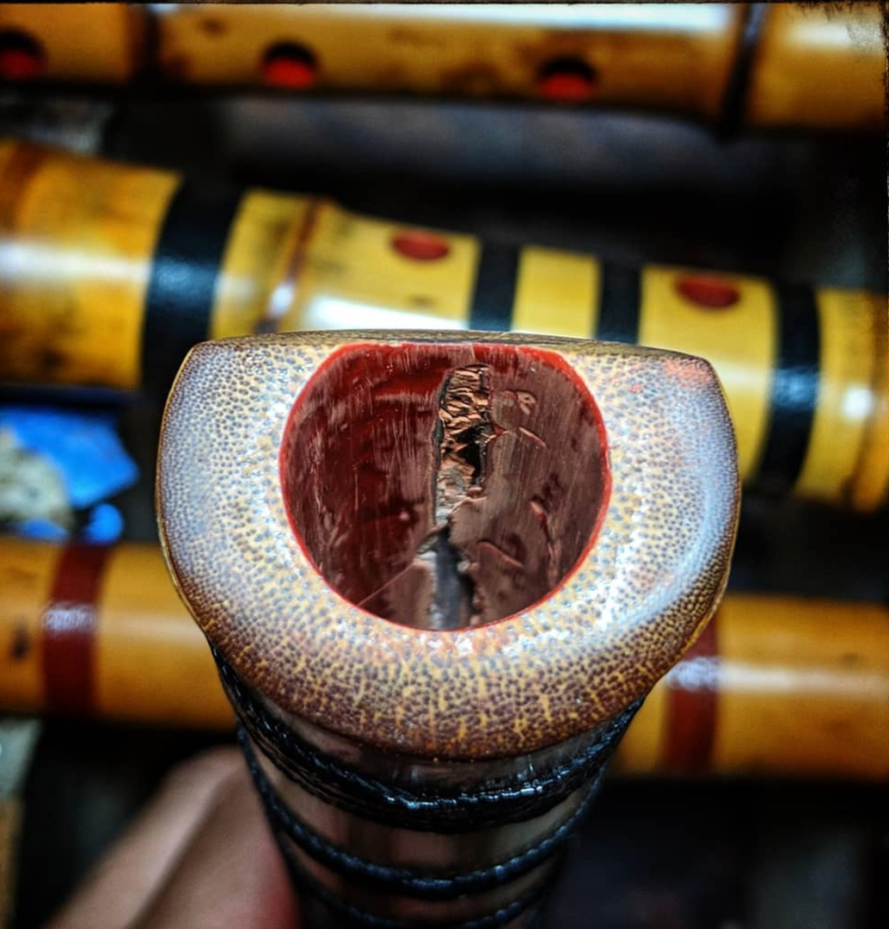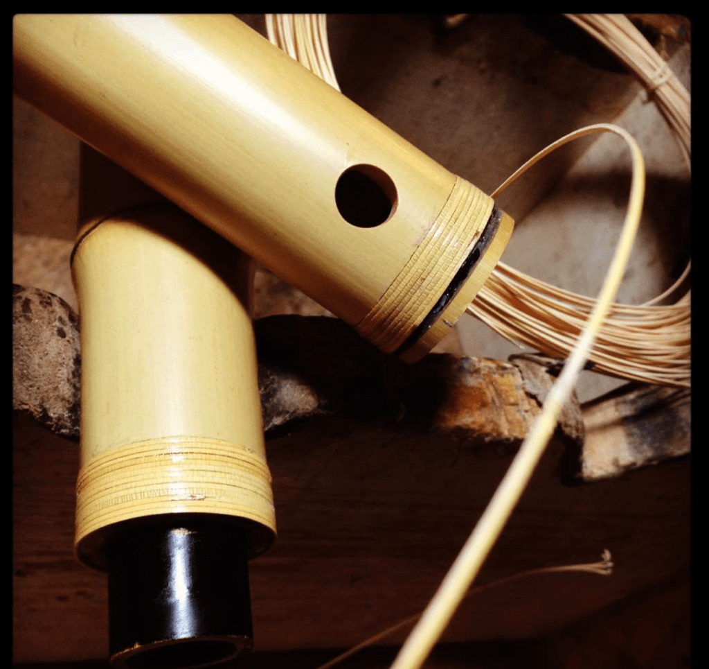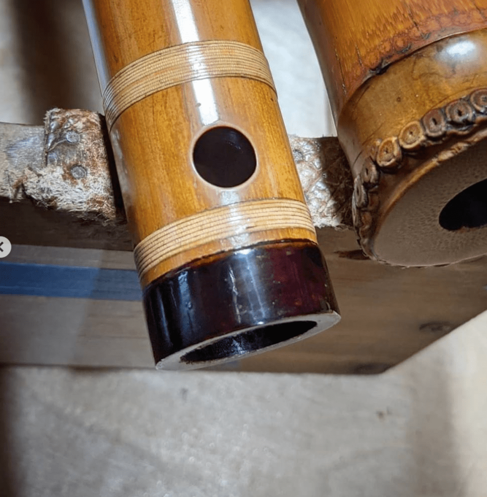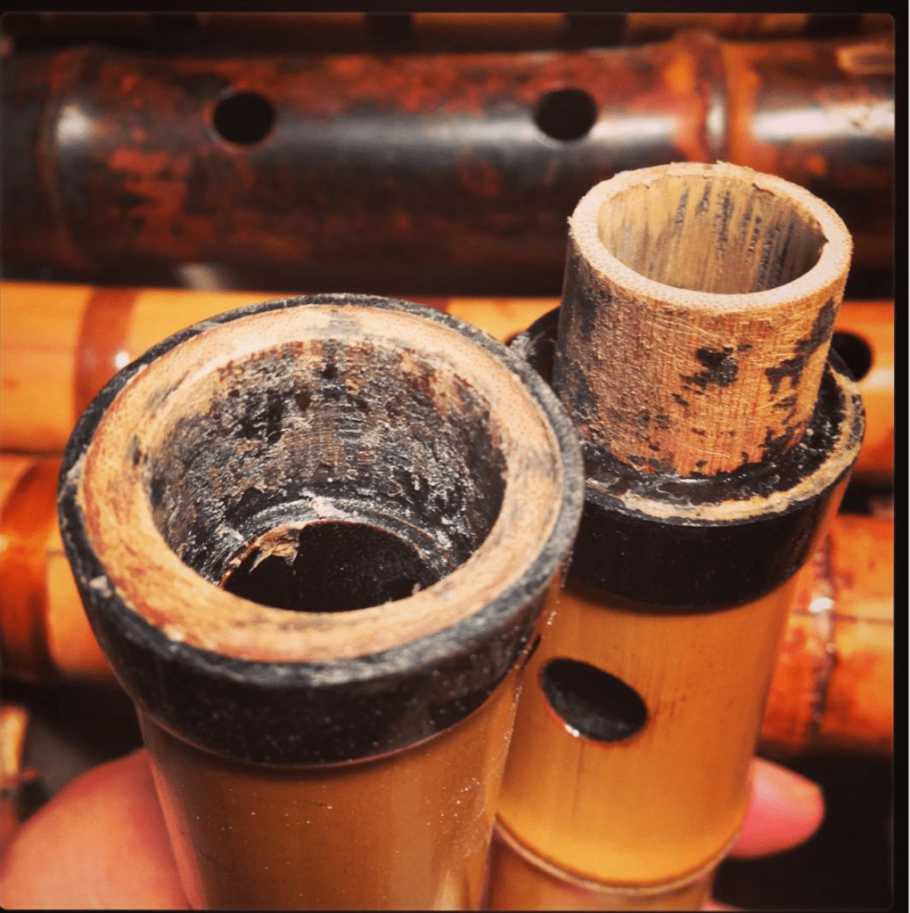 There are many ways to approach shakuhachi repairs since there are many different kinds of damages and each is unique to the individual flute. Most often, I choose my non-invasive Low-Impact Method. This means that if a repair can be undertaken without removing any of the original parts, such as filling an utaguchi chip instead of replacing the horn inlay or topical binding instead of inlay rattan, I would go that route first. I believe that the non-invasive method respects the bamboo spirit and the structural integrity of the instrument. The photos above shows a crack two-piece flute with three different kinds of topical bindings performed by three different repairmen. Any repair can be beautiful in a Zen Wabi Sabi way.
