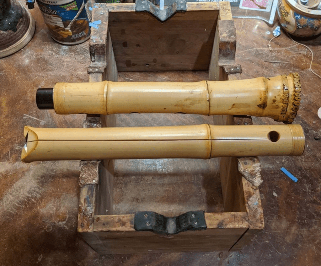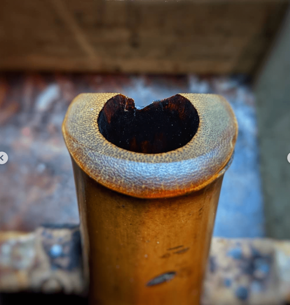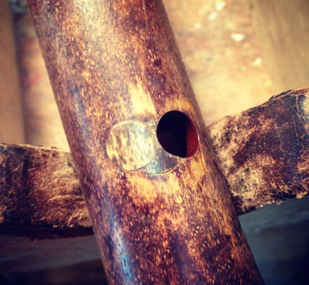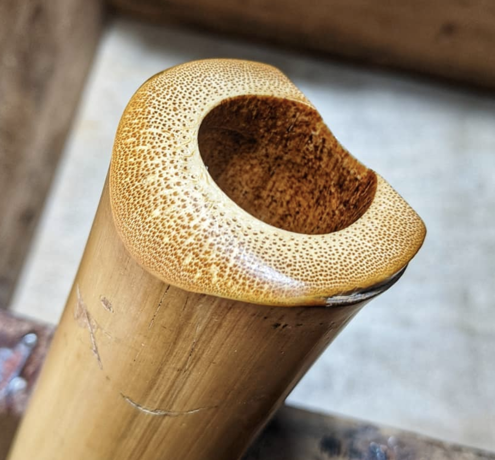 There are many ways to approach shakuhachi repairs since there are many different kinds of damages and each is unique to the individual flute. Most often, I choose my non-invasive Low-Impact Method. This means that if a repair can be undertaken without removing any of the original parts, such as filling an utaguchi chip instead of replacing the horn inlay or topical binding instead of inlay rattan, I would go that route first. I believe that the non-invasive method respects the bamboo spirit and the structural integrity of the instrument. The photos above shows a crack two-piece flute with three different kinds of topical bindings performed by three different repairmen. Any repair can be beautiful in a Zen Wabi Sabi way.