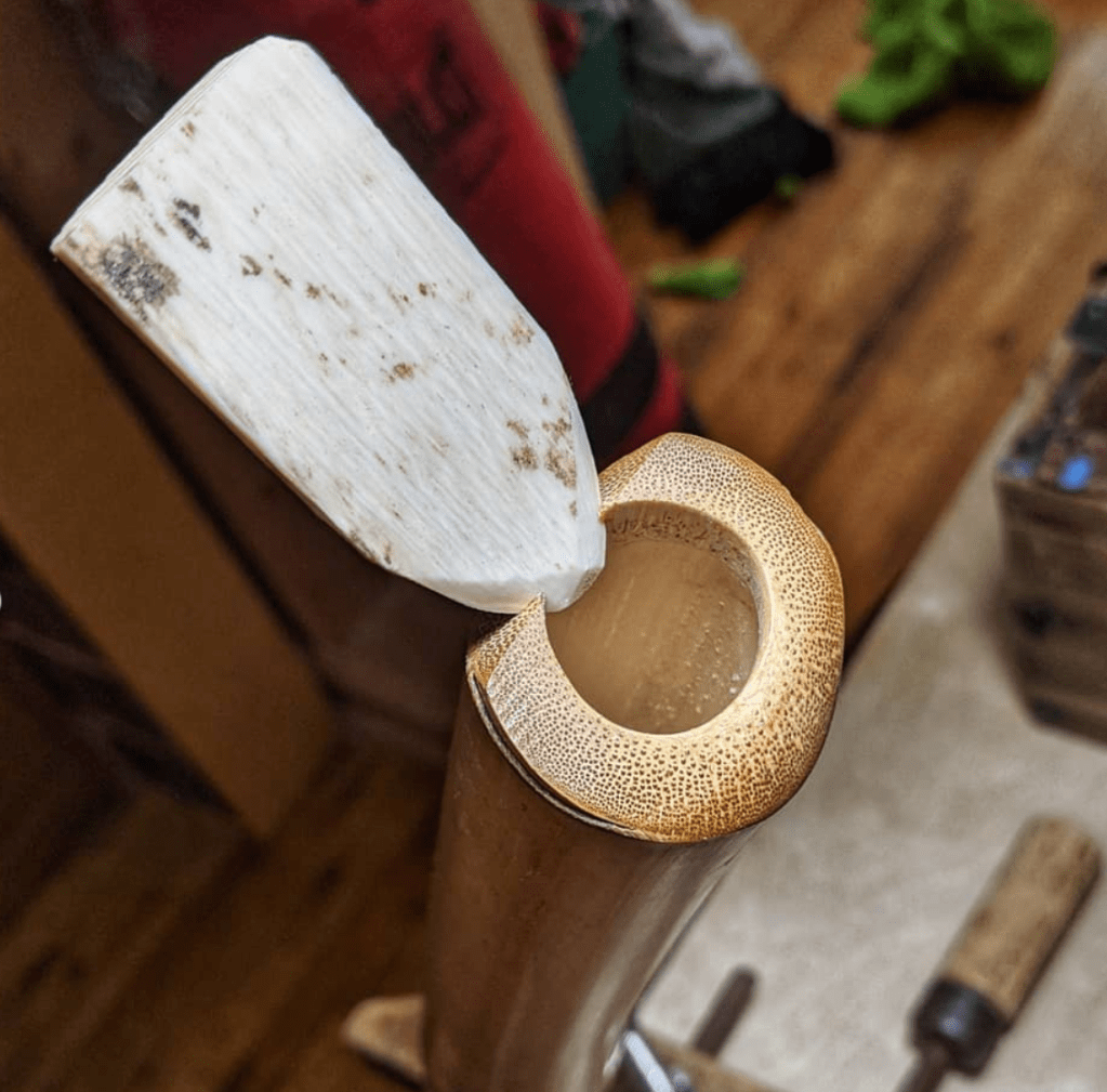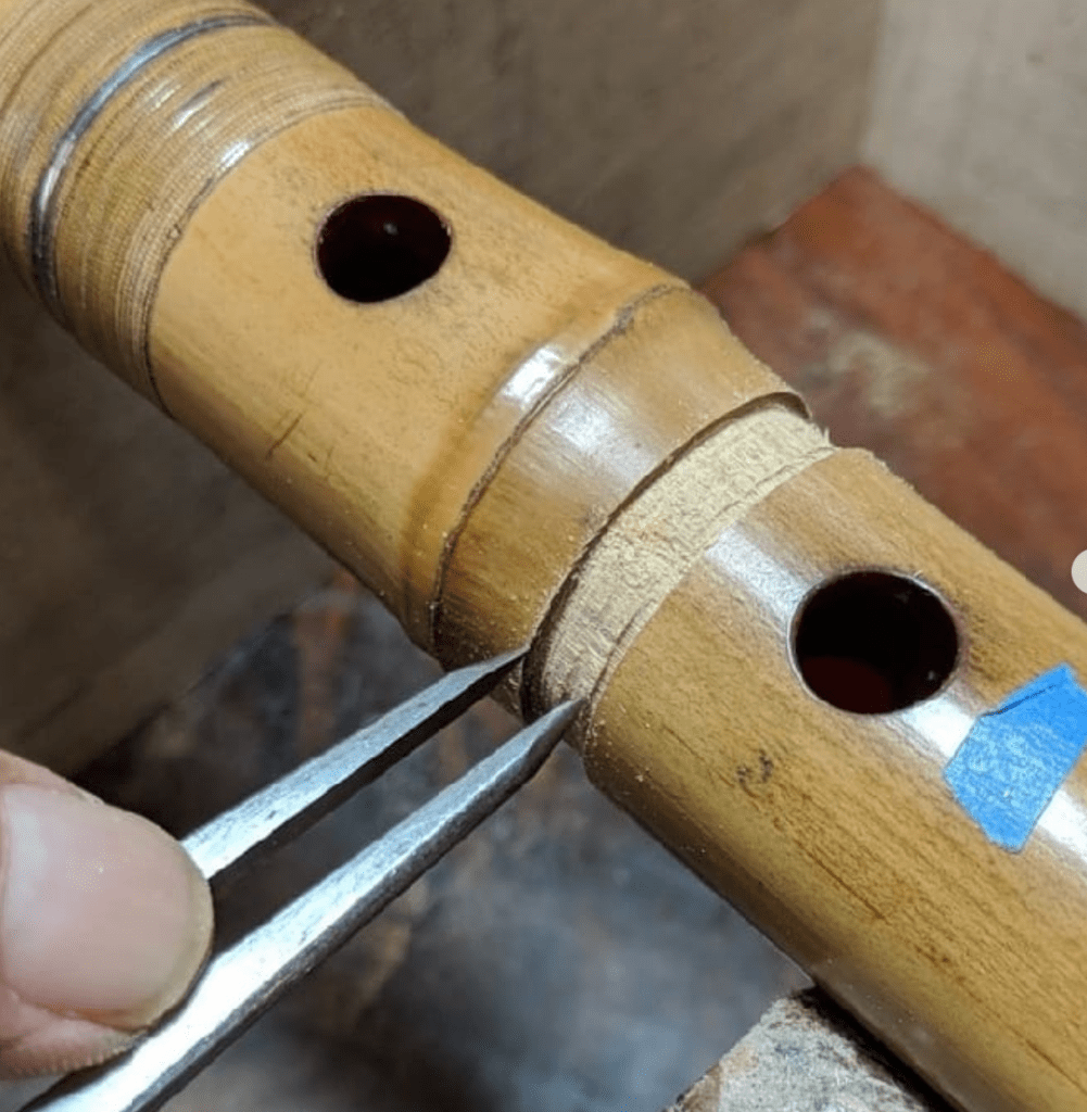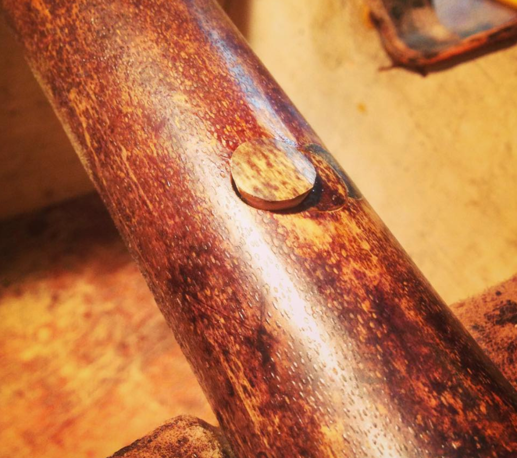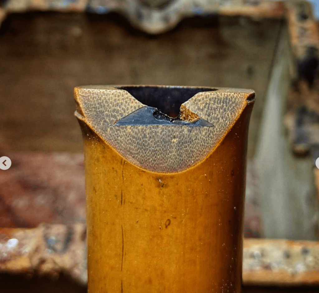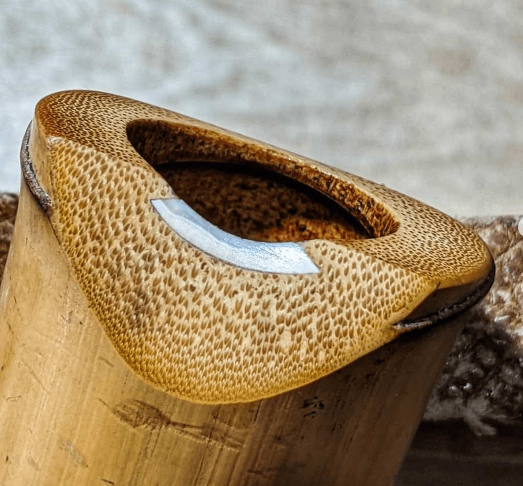 There are many ways to approach shakuhachi repairs since there are many different kinds of damages and each is unique to the individual flute. Most often, I choose my non-invasive Low-Impact Method. This means that if a repair can be undertaken without removing any of the original parts, such as filling an utaguchi chip instead of replacing the horn inlay or topical binding instead of inlay rattan, I would go that route first. I believe that the non-invasive method respects the bamboo spirit and the structural integrity of the instrument. The photos above shows a crack two-piece flute with three different kinds of topical bindings performed by three different repairmen. Any repair can be beautiful in a Zen Wabi Sabi way.